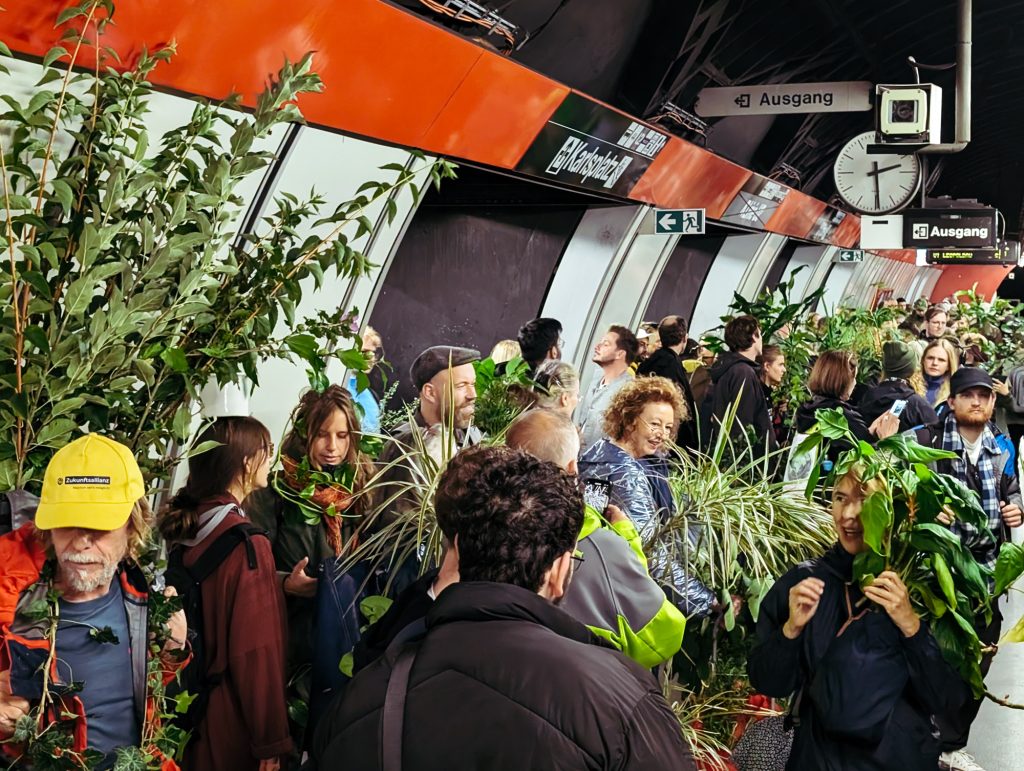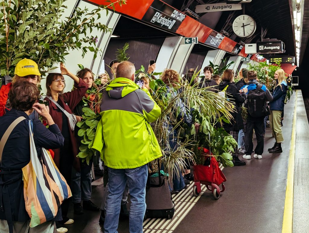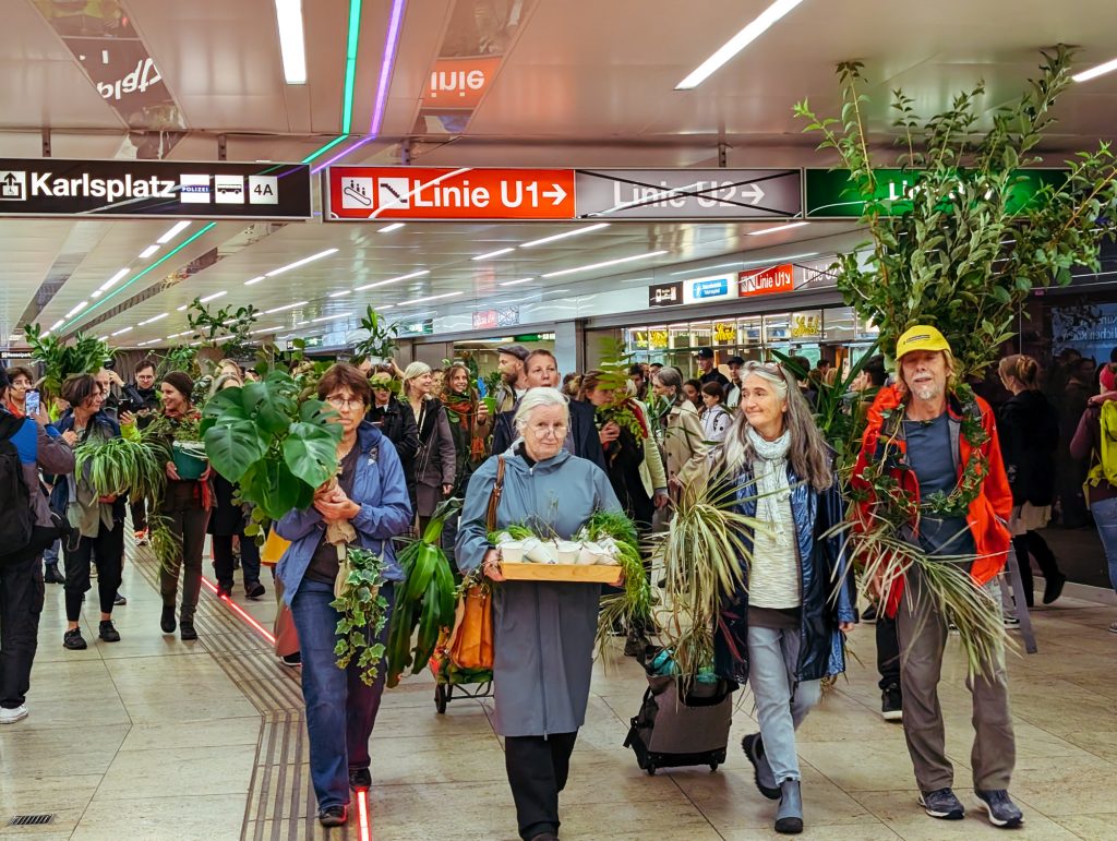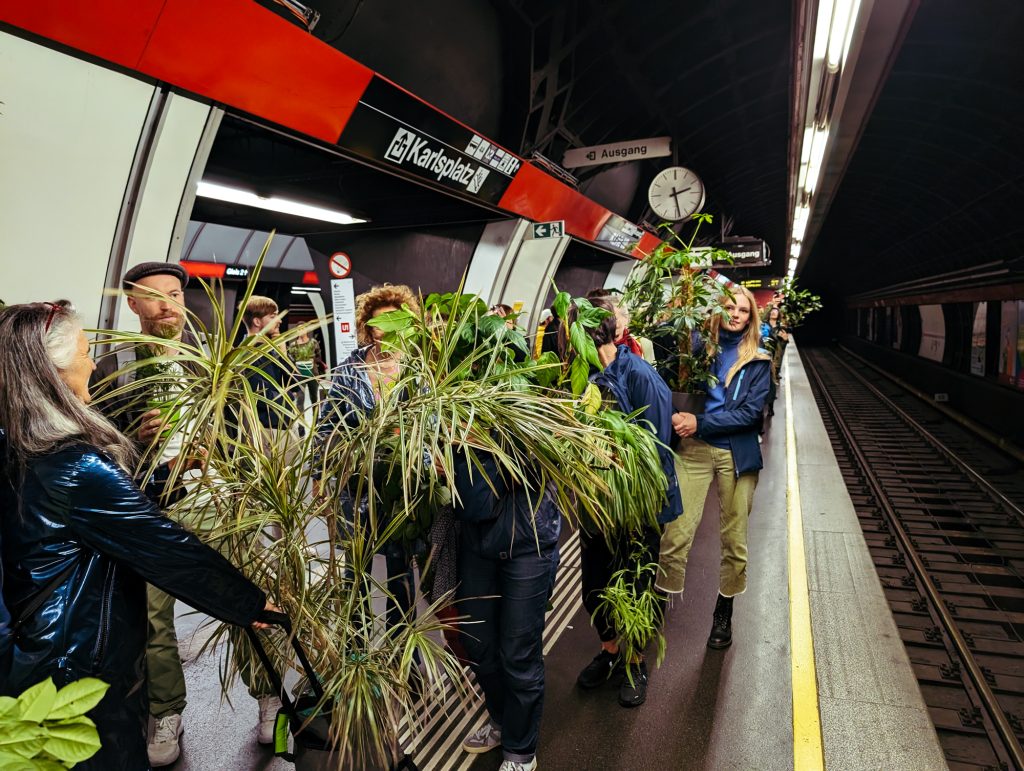 Today, a renaturation flash mob took place on the streets and in the subway in Vienna, initiated by Viennese artist and climate activist Tom Poe and supported by “Klimabox” and “Artists For Future Austria”. Over 50 people equipped with their (potted) plants and sound boxes with nature sounds to renature the public space together.