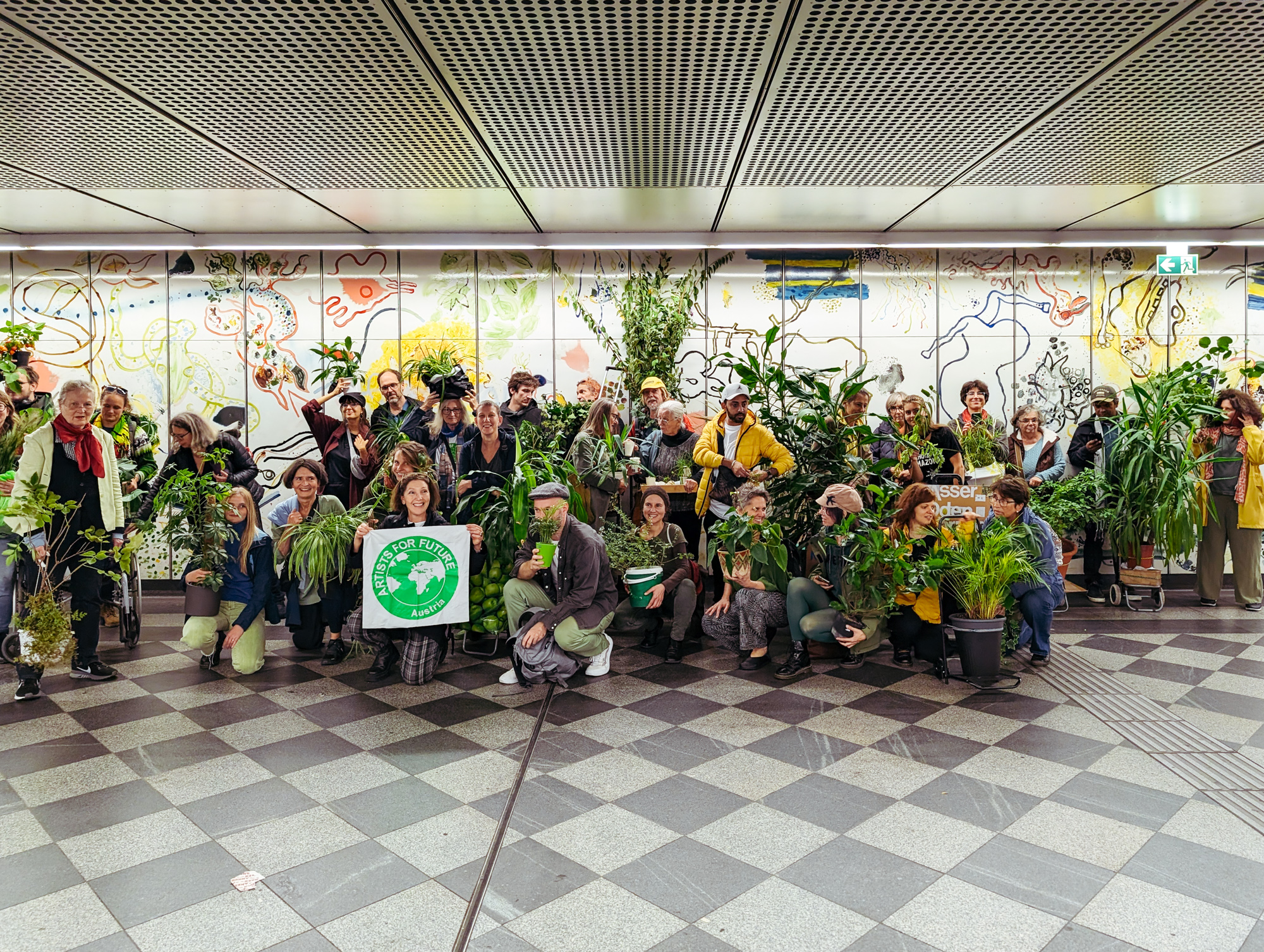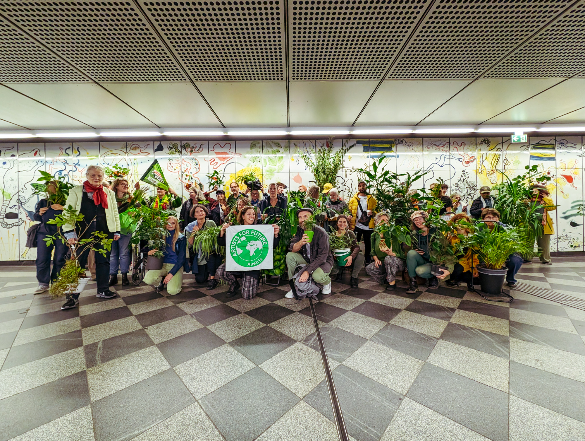 Today, a renaturation flash mob took place on the streets and in the subway in Vienna, initiated by Viennese artist and climate activist Tom Poe and supported by “Klimabox” and “Artists For Future Austria”. Over 50 people equipped with their (potted) plants and sound boxes with nature sounds to renature the public space together.